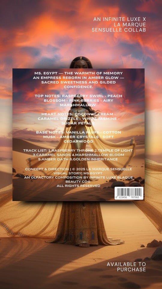 - Ms. Egypt Balm: Raspberry swirl, peach blossom, coconut cream, vanilla fluff, amber crystals playful, sweet, royalty reimagined.